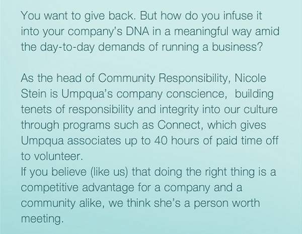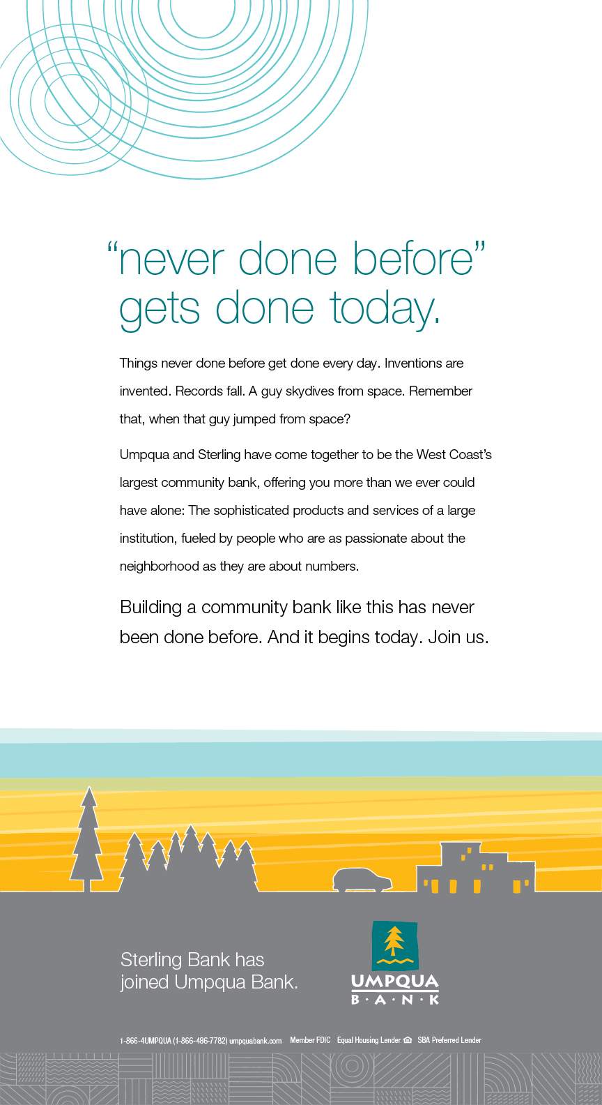 A national ad announcing Umpqua's merger with Sterling Bank, which made us the West Coast's largest community bank. I wrote this on deadline when an agency couldn't deliver something on brand.